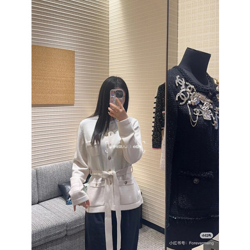 샤넬 벨트 장식 배색 니트 가디건 (컬러 아이보리, 블랙)